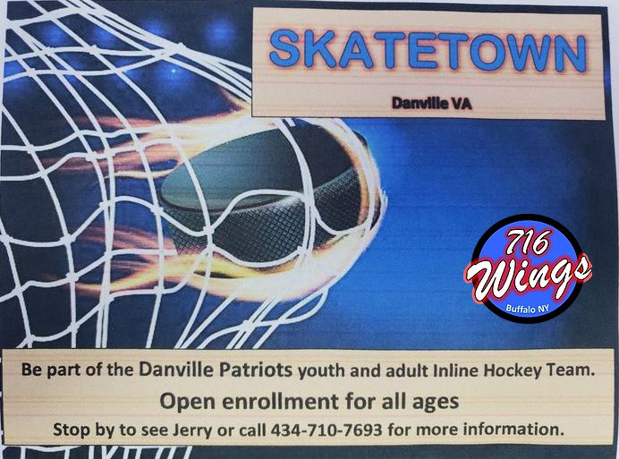 "716 Wings" is proud to announce that we will be sponsoring the Danville Patriots Inline Hockey Team. They currently have openings for all age groups. Please stop by SKATETOWN or call Jerry at 434-710-7693 for additional information.|